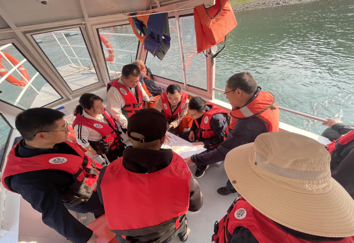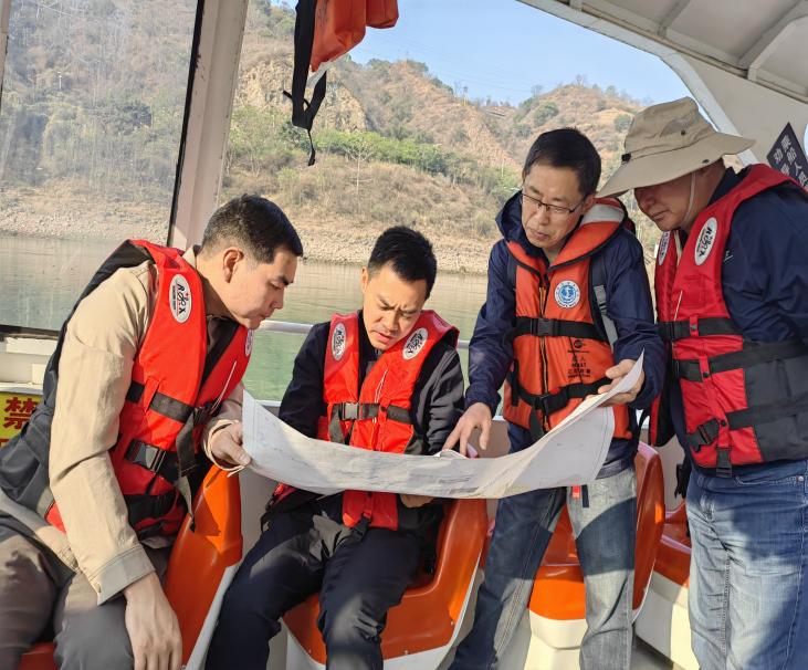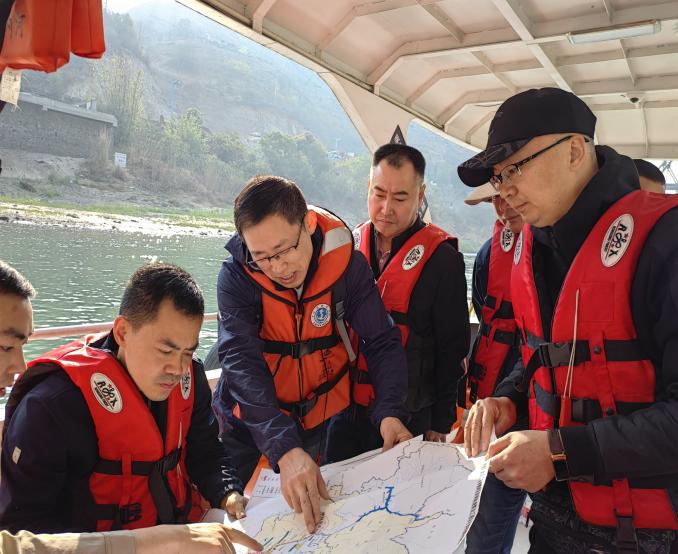 唐忠柱一行乘船从项目起点两江口(雅砻江与金沙江交汇处)至项目终点平地师庄(四川省与云南省交汇处),沿江查看了航道整治点位和航道维护工作站情况,听取了项目推进情况工作汇报,对城建交通集团项目前期工作推进的成果表示肯定。